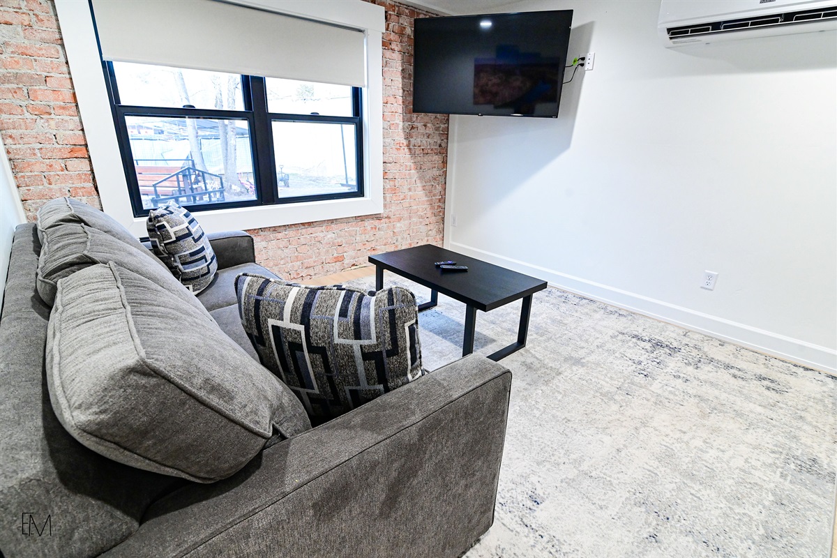 Living room with a queen-size pullout sofa sleeper and cable TV